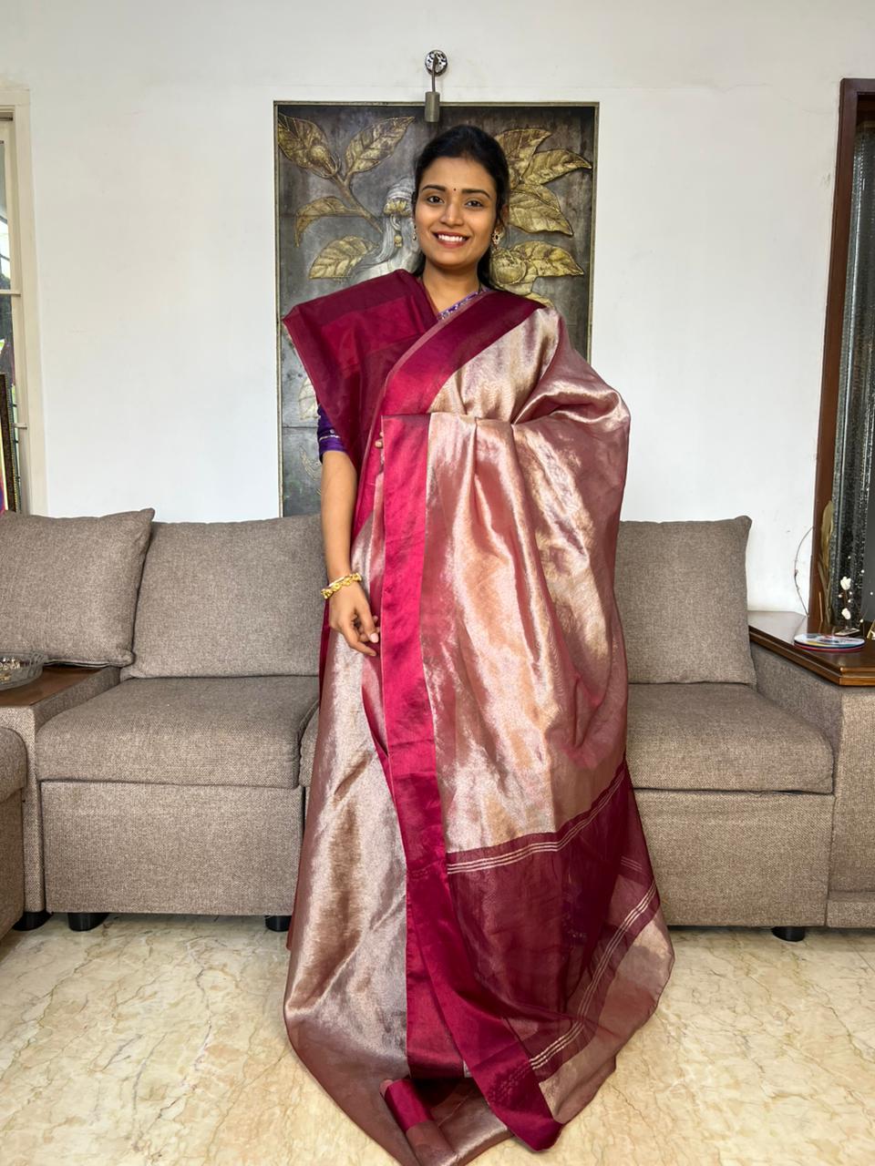 Sale !! Beautiful Soft Tissue Saree With Satin Border !! Unstitched blouse attached.