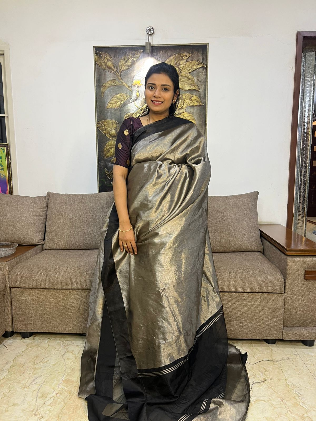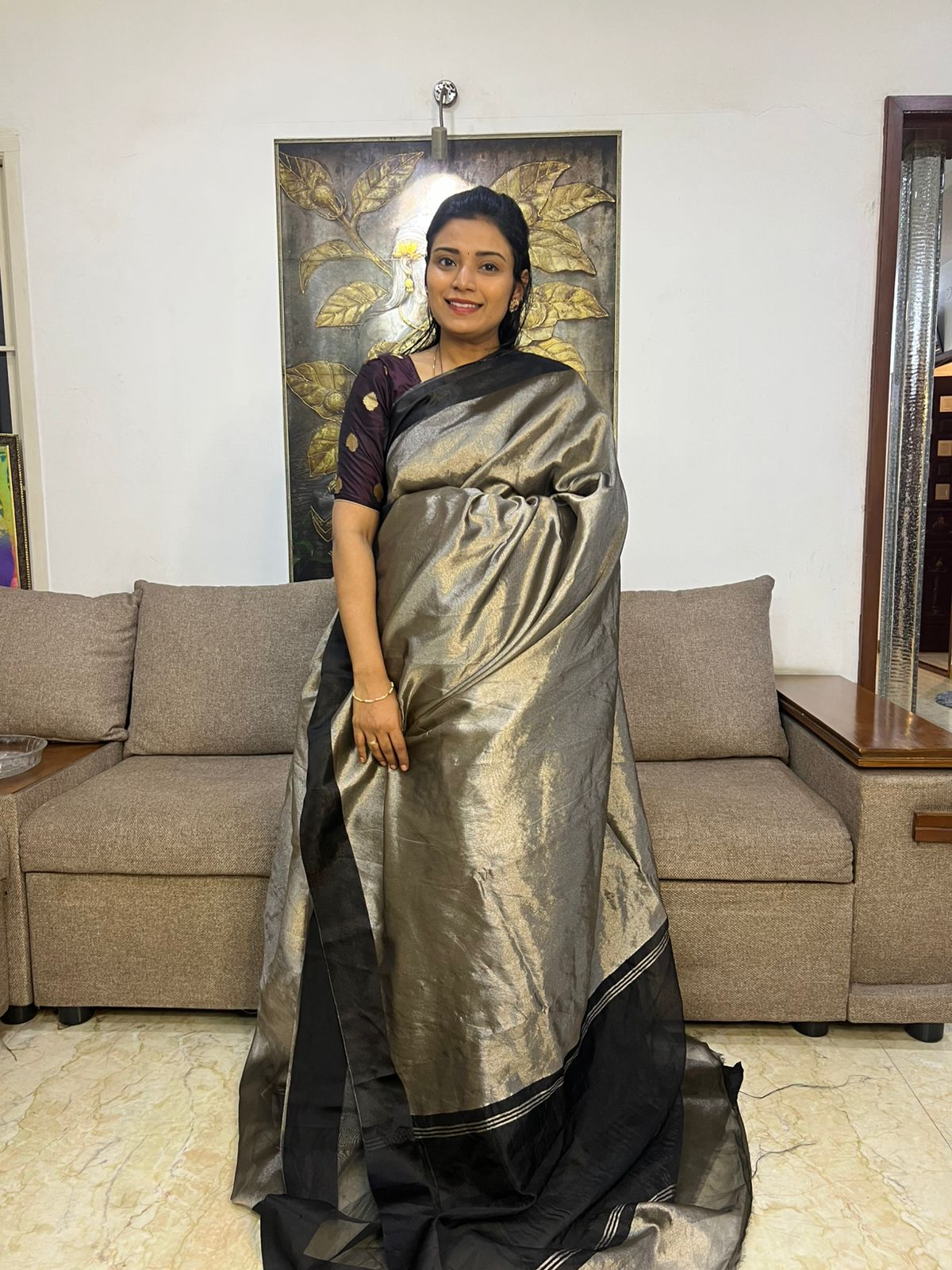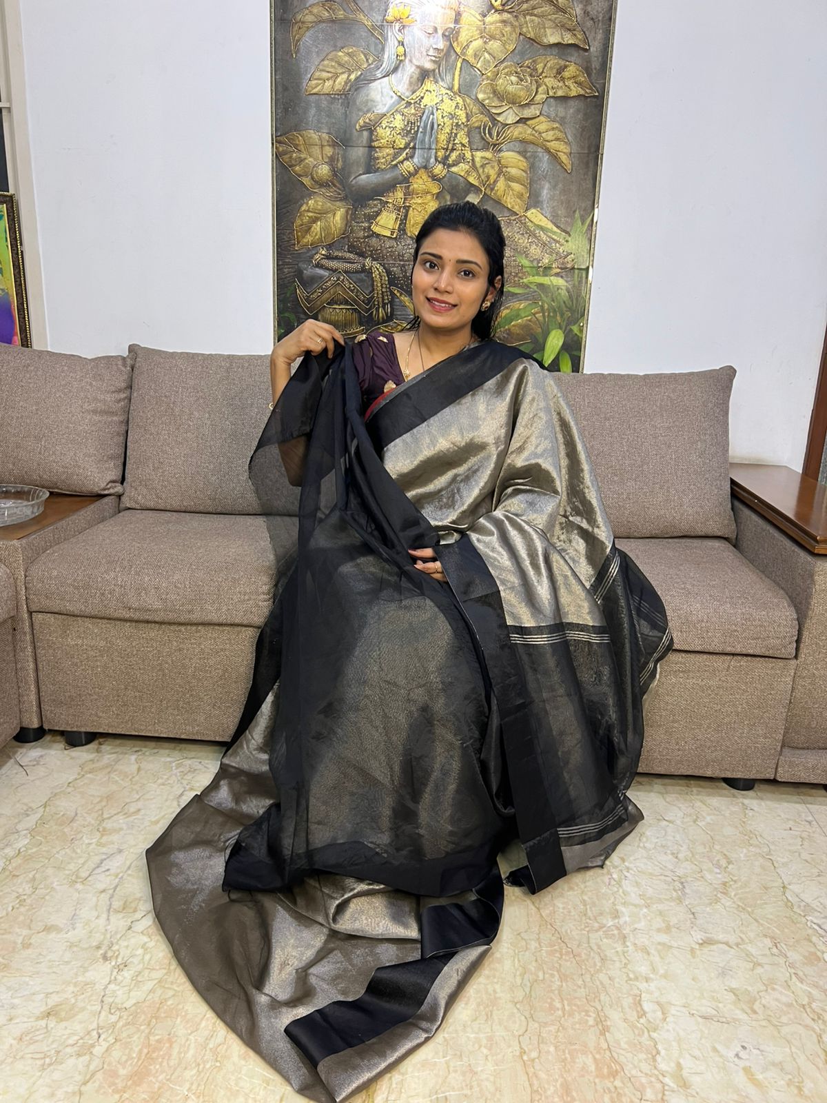 Beautiful Grey Tissue Saree With Satin Border