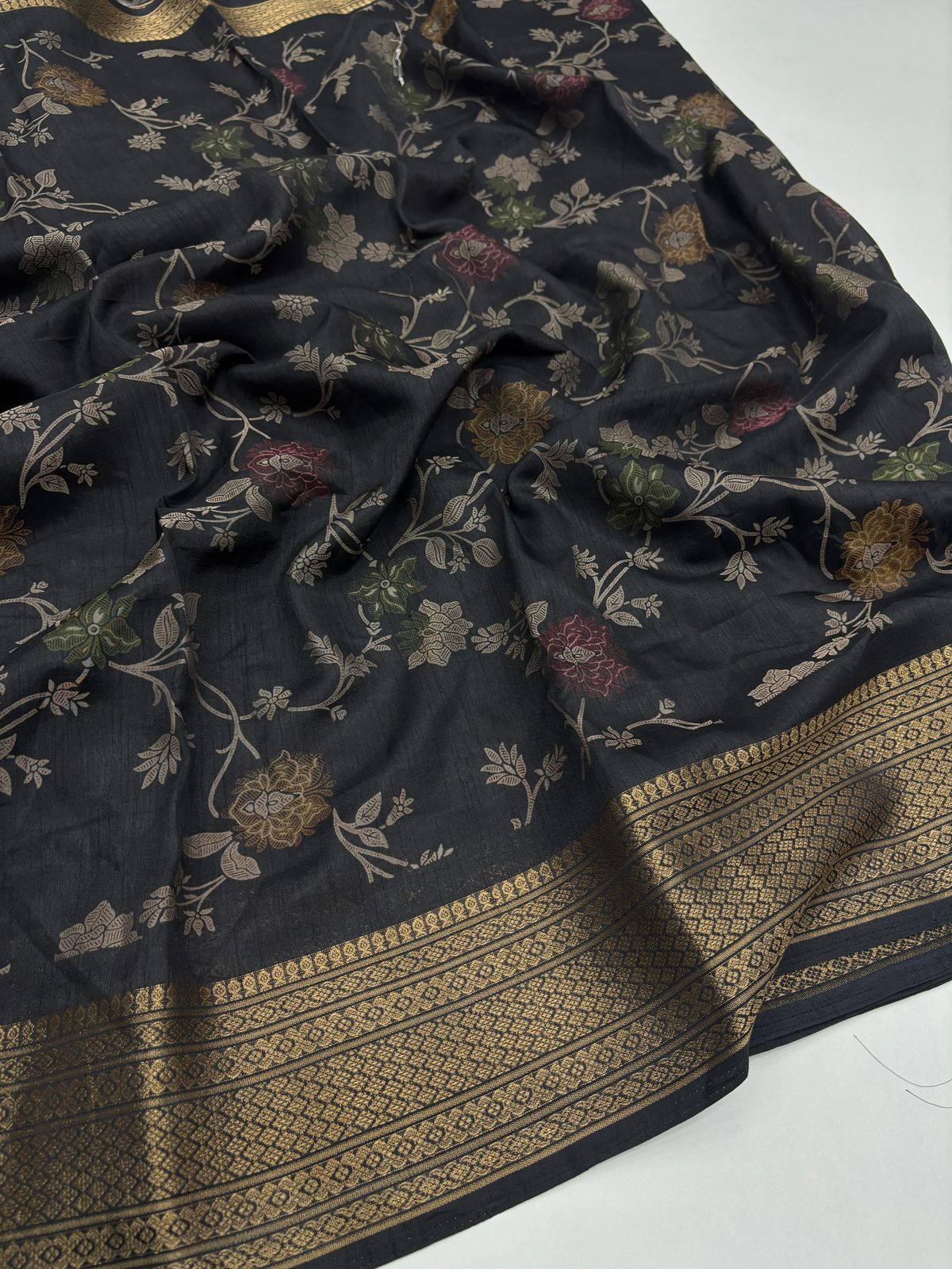 The saree features a luxurious zari woven border and intricate floral motifs, making it ideal for weddings, festive wear, parties, and special occasions.